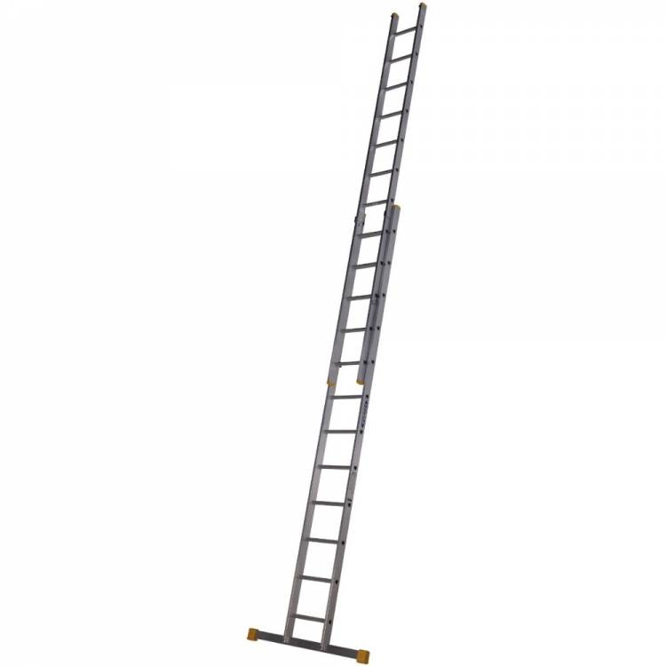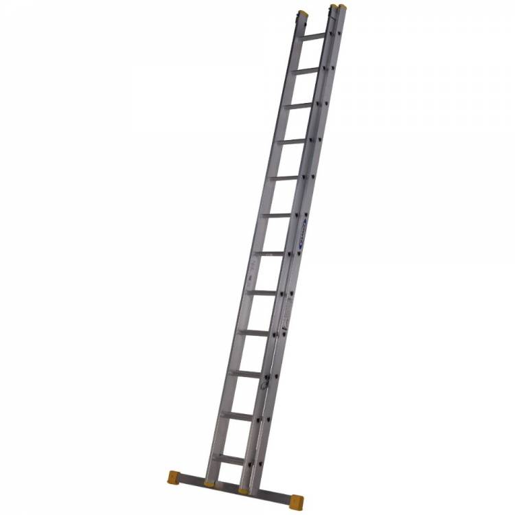 This 722 Series 3.53m double section extension ladder is made from high grade aluminium and extends to 6.03m. With box section stiles designed to ensure the ladder is lightweight but strong, this ladder is a ideal for jobs around the work site. Features include manual thumb operated locking catches to prevent sections separating, slip resistant D-shaped rungs and a wide stabiliser for added safety during use. Approved to the latest EN131 standard. For Professional Use.